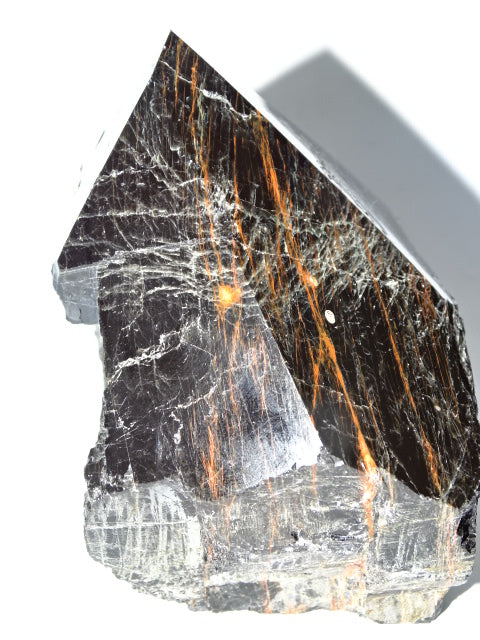 Rough cut with polished point Tourmaline crystal with Iron Inclusions This piece measures approx. 8.5cm H x 4cm x a thickness of approx 5cm. Black ...