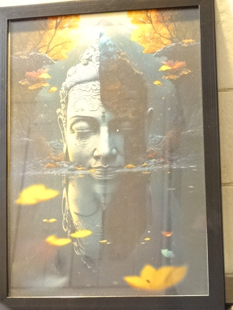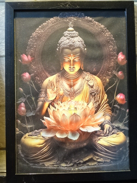 Spiritual canvas print of a beautiful Buddha with Lotus Flower Wood and Glass Frame Approx 34cm x 24cm PLEASE NOTE This picture is Ex Shop Display...