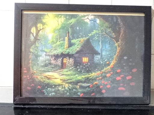 Pretty Fairy Cottage Canvas Print Wood And Glass Frame Approx 34 x 24cm