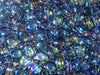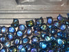 Adorable blue puss cat head shaped glass beads that are full Ab rainbow plated
