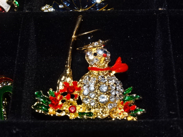Cute large statement snowman festive brooch decorated with Diamond White and Festive Red rhinestones and a cute Black enamelled Top Hat together with a enamelled red scarf to complete his look!