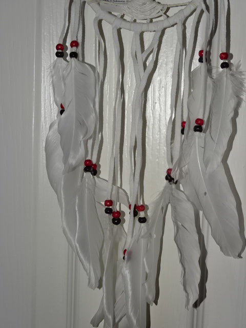 This Dream Catcher depicts a very pretty but powerful, black and red tree of life emblem made with wooden beads finished with white feather decoration