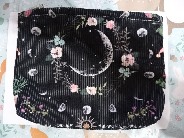 Very Pretty Multi Purpose bag in a Moon Phase and Flowers print design on a corded black velvet feel black background.